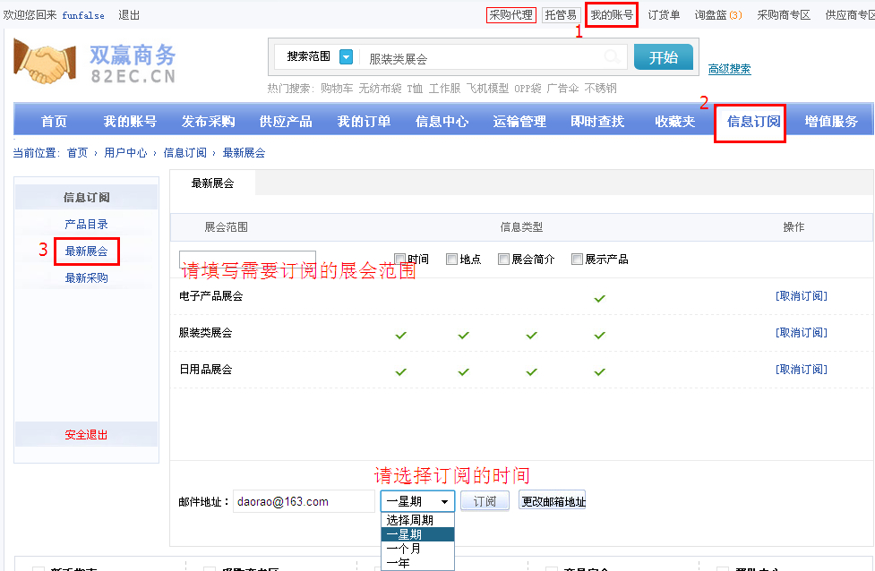 输入展会范围-选中信息类型-选择周期-点击订阅